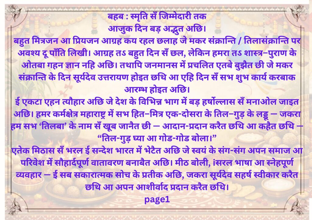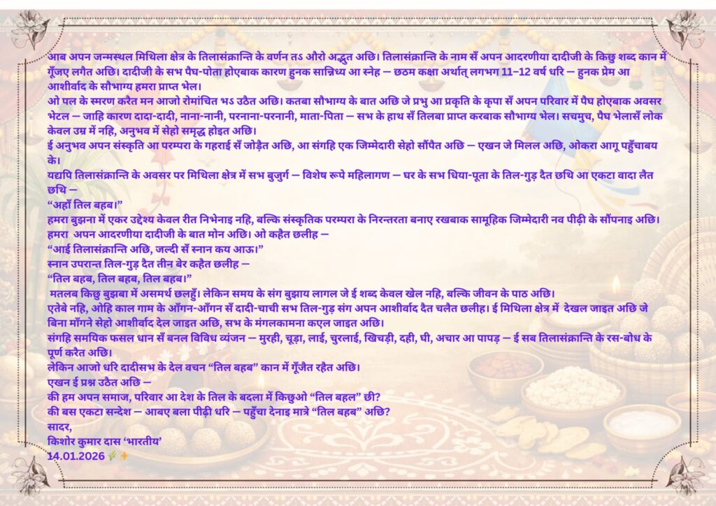 तिल बहब : स्मृति सँ जिम्मेदारी तक Post author:info@kishorsdas.blog Post published:January 15, 2026 Post category:Uncategorized Post comments:0 Comments You Might Also Like जागो युवा: उद्यम का उजाला तुम्हारे भीतर है May 28, 2025 June 16, 2025 “प्रकृति का निराला खेल और मानव का विवेक” किशोर कुमार दास “भारतीय” 29/06/2025 June 30, 2025 Leave a Reply Cancel replyCommentEnter your name or username to comment Enter your email address to comment Enter your website URL (optional) Save my name, email, and website in this browser for the next time I comment.